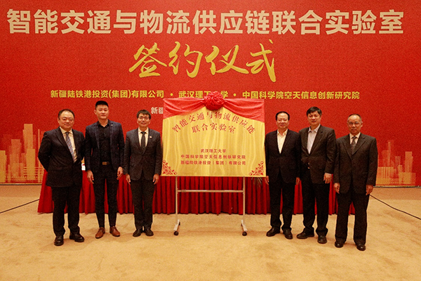 3月10日,智能交通与物流供应链联合实验室(以下简称“联合实验室”)签约揭牌仪式在新疆乌鲁木齐市举行。副校长吴超仲、新疆维吾尔自治区政协副秘书长叶美金,乌鲁木齐市委副书记、市政协党组书记张钰祥、乌鲁木齐甘泉堡经济技术开发区(工业区)管理委员会主任程新建、中科院空天信息创新研究院-国家遥感应用工程技术研究中心(简称“空天院”)副主任孙麇、新疆陆铁港投资(集团)有限公司(简称“陆铁港集团”)董事长叶浩出席签约揭牌仪式。