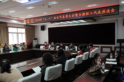 2013年3月7日下午, “三八”妇女节表彰大会暨女教职工代表座谈会在校工会西院会议室召开。校党委副书记、工会主席邱观建,校常务副主席李运祥,校工会副主席、女工委员会主任陈玲,校女工委员会委员及受表彰的女教职工70多人参加会议。