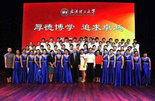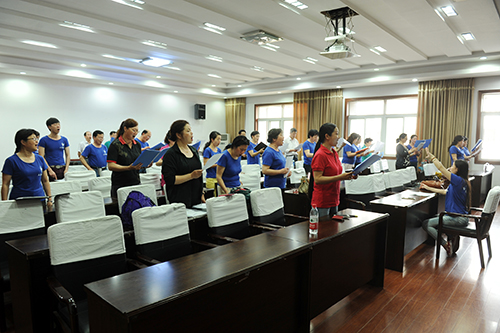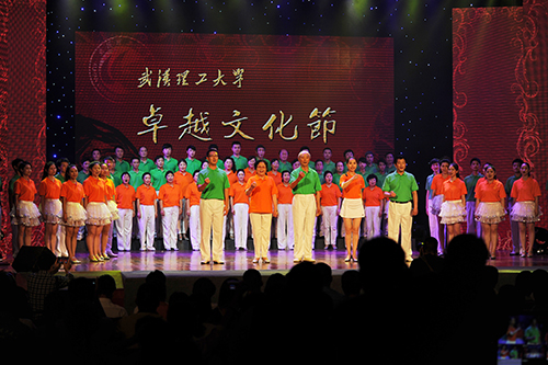 此次参加演出的合唱团由在职职工、离退休职工和学生共同组成。2015年4月底校歌曲谱完成后,学校决定在合并组建十五周年纪念活动中发布校歌,校工会接到任务后立即将教职工“乐莺合唱团”和学生合唱团联合,开始了紧张有序的排练。时间紧,任务重,队员分布在马区和余区,给排练带来了极大地困难,经过协商,在马区、余区轮流安排排练。排练过程,队员们相互帮助、结伴而行,克服各种困难。老教师邹玉生,自合并以来就是教职工合唱团成员,多次在学校举行的各种活动中表演。此次排练期间,他家四代人都在医院,他的父母年迈生病住院了,由他夫人照料;他又喜得孙子,儿子儿媳妇都在医院,这种情况下,他仍然一次不落的坚持参加合唱团排练,直到演出结束后才带着内疚的心情赶往医院;81岁的蒋文焕老师和60多岁的樊腊春老师坚持参加每一次的排练,服从组织安排,精神状态饱满;年轻教师陈珺瑾的爱人在川外学习,她只好每次带着孩子到排练场地参加排练。作为声部长,她认真负责,完成声部的训练,同时,她还承担了演出的化妆任务;此次参加演出的学生全部来自于余家头校区,每次训练学生们都安排好作息,按时赶往马区与教师们合练;指挥老师邓小峰的父亲在排练期间生病了,但他仍坚持参加合唱团的训练…当问到是什么让他们这样不惜牺牲休息时间、不辞辛劳、克服重重困难坚持排练时,他们说:“作为理工大的一员,我感到骄傲,此次有机会作为校歌首次发布的演唱者,我感到无上荣光!”